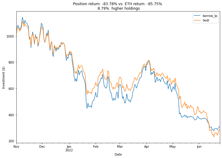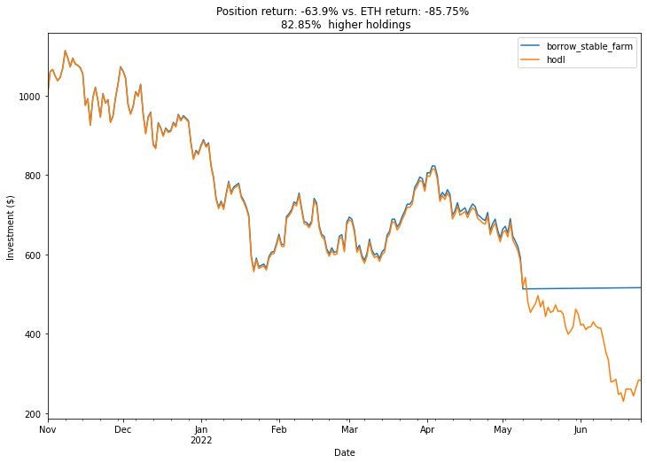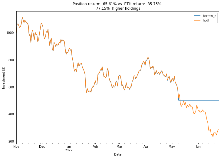 Having your assets work for you is definitely how you get bigger returns going up, but can they help when things go down too? Yes, definitely. So long as you do the right things with your borrowed assets. I'll cover three scenarios assuming you deposited some ETH into Aave at the height of the market, I chose November 1st 2021. I also assumed you borrowed a stable coin like USDC that maintained it's peg (it's a lot easier to repay if it doesn't) at a 50% Loan to Value ratio at time of deposit. So let's see what just hodling ETH would have done compared to borrowing against your assets at the top of the market and experiencing a liquidation. Scenarios are run with a $1,000 ETH investment deposited in a lending protocol on November 1 with a 50% LTV with a 1% borrow APR. ETH also has a 5% liquidation premium.