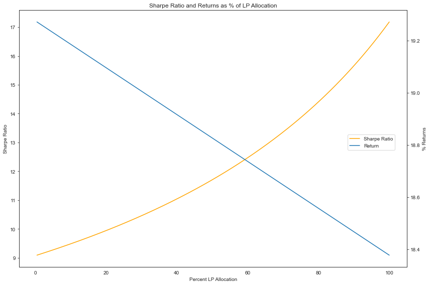 This chart shows both the returns and Sharpe Ratios plotted with the x axis as the % of your portfolio you allocate to the LP position. I lowered the yield of the LP to an even more horrendous 5% to show a lower overall return and the inverse relationship with the Sharpe.