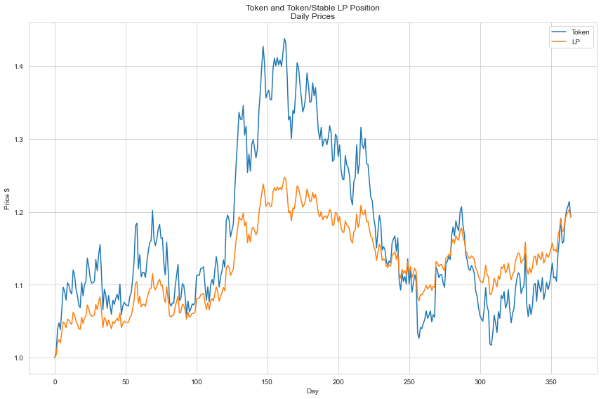 Here is the token daily prices and LP prices which we can see aren't as volatile: